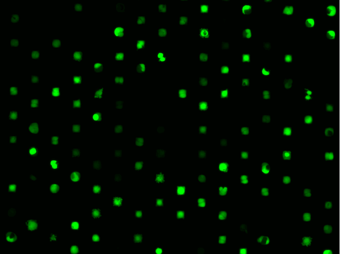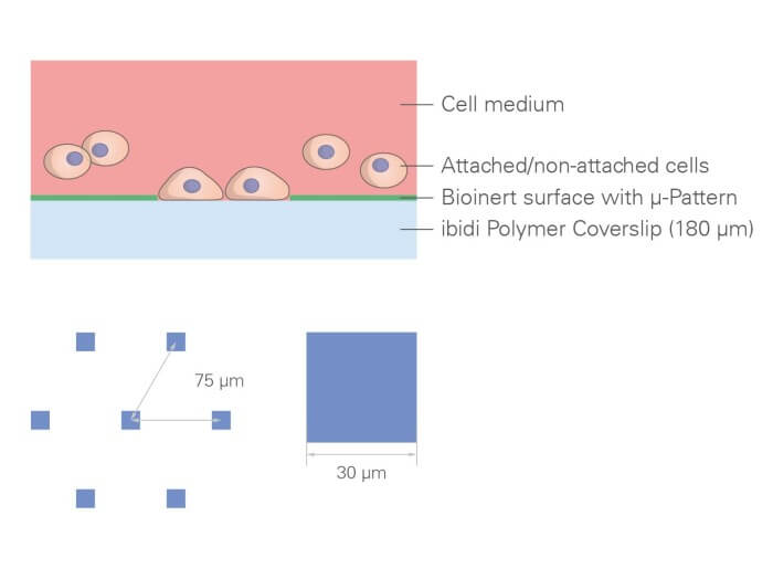 ibidi 的 µ-Patterns 可用于從細胞懸液中創(chuàng)建精準的單細胞陣列,使細胞能夠在限定區(qū)域內(nèi)直接粘附并生長于圖案表面。